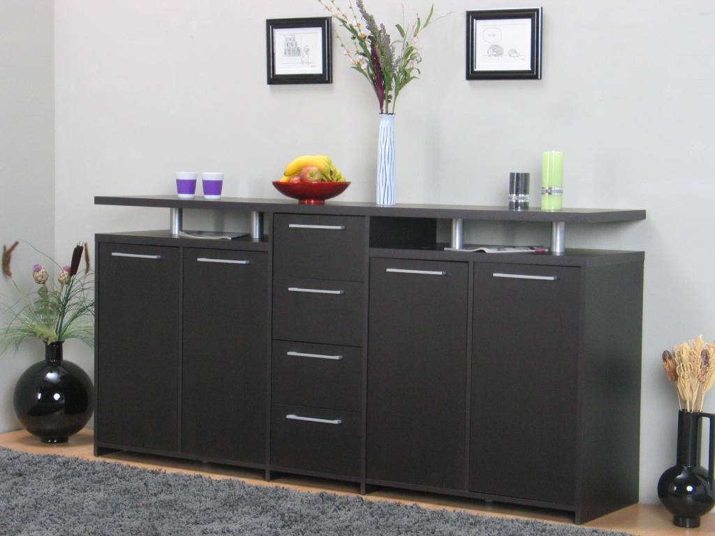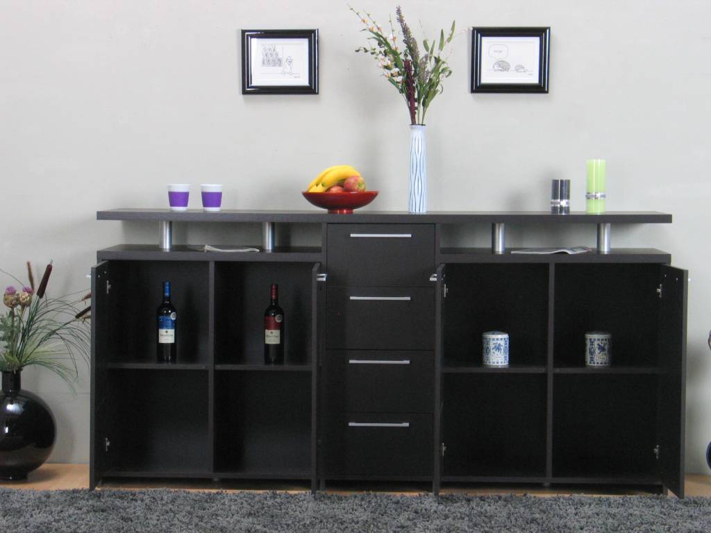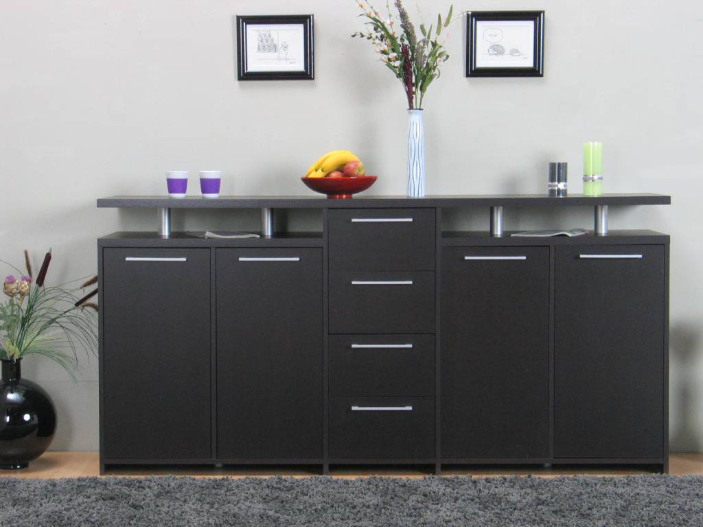 Breed ruim dressoir Naia van 212 cm breed, in zwartbruine kleurstelling, compleet met 4 lades en 4 deuren, dus zeer veel opbergruimte voor een uiterst aantrekkelijke prijs!
