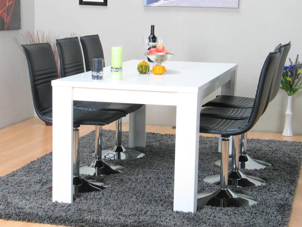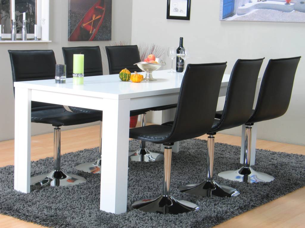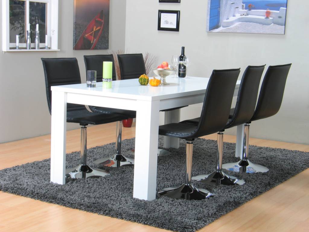 Elegante eethoek, bestaande uit 6 zwarte draaistoelen June en een witte tafel genaamd Kate. Breng stijl in uw woonkamer of kantoor en bestel deze eethoek vandaag nog!