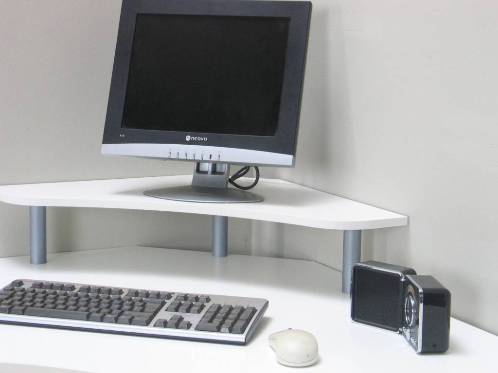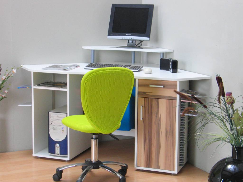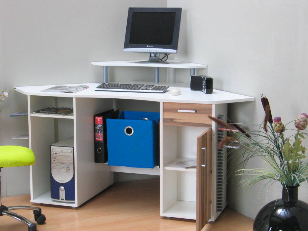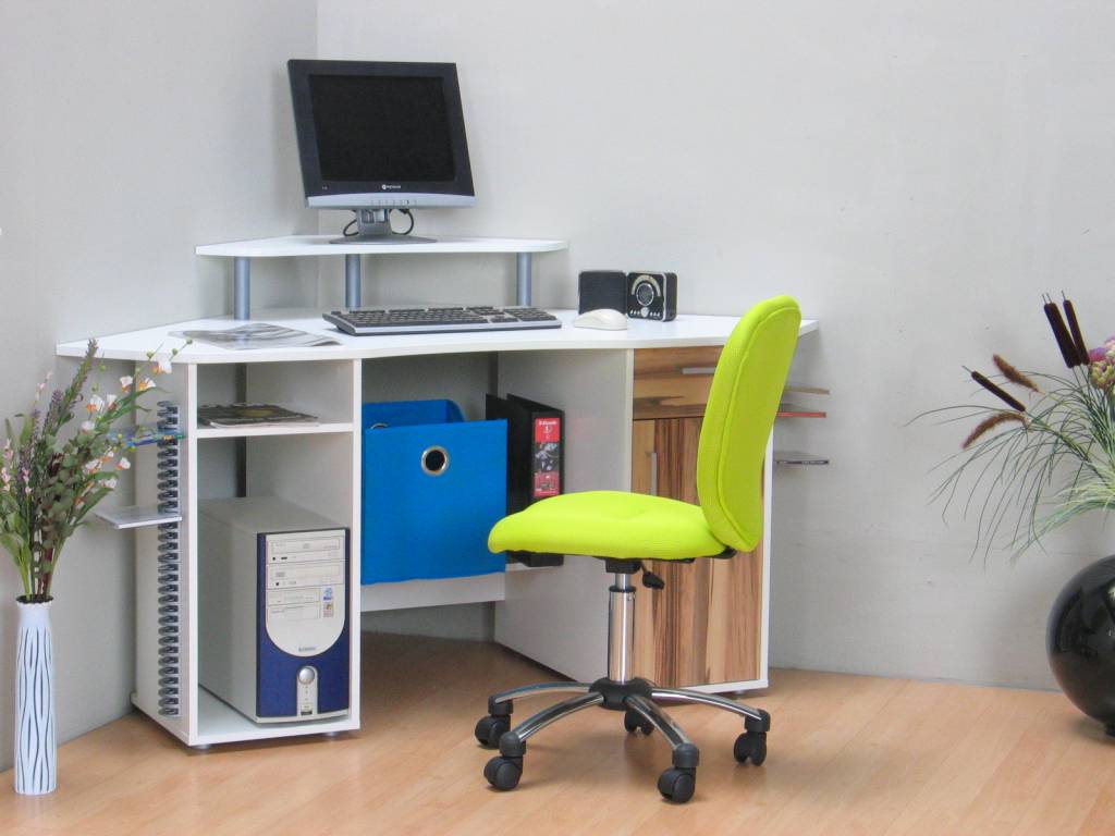 Wit hoekburo met veel functies, ideaal voor in de kleine ruimtes. Een wit hoekburo met licht walnootkleurige accenten: iets voor in de studeerhoek?