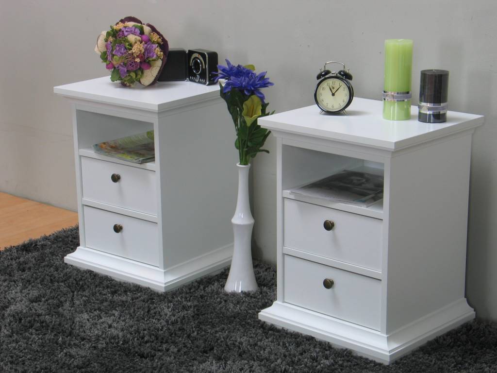 Een set van 2 nachtkastjes voor een voordelige setprijs! Deze witte nachtkastjes passen goed bij bijvoorbeeld de kledingkast of commode uit dezelfde serie. Kijk ook naar de andere artikelen in ons woonprogramma Venetië!