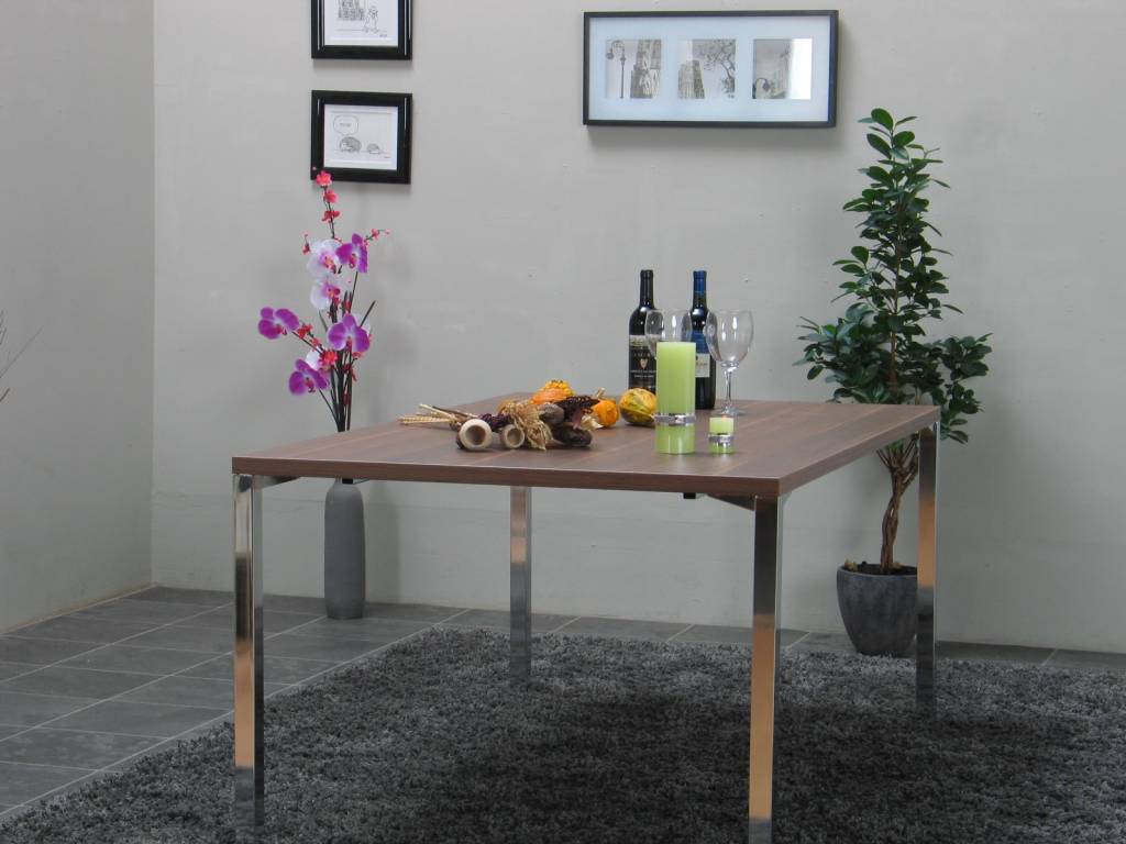 Moderne tafel van 160 x 100 cm met glad diep walnootkleurig tafelblad en chromen poten. Haal dit topmeubel voor in de woonkamer of keuken nu in huis!