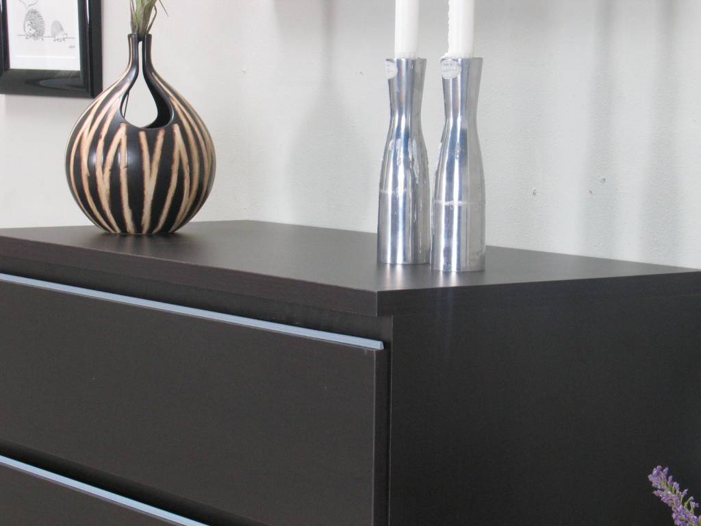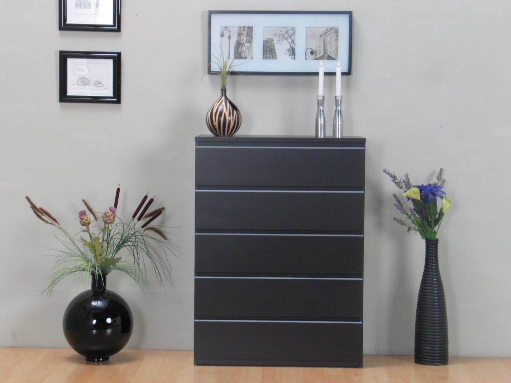 Ruime ladenkast Verona, met 5 lades. Een voordelige ladenkast in zwartbruine kleur van 109cm hoog en 80,5cm breed, leuk in combinatie met bijvoorbeeld het nachtkastje Verona.