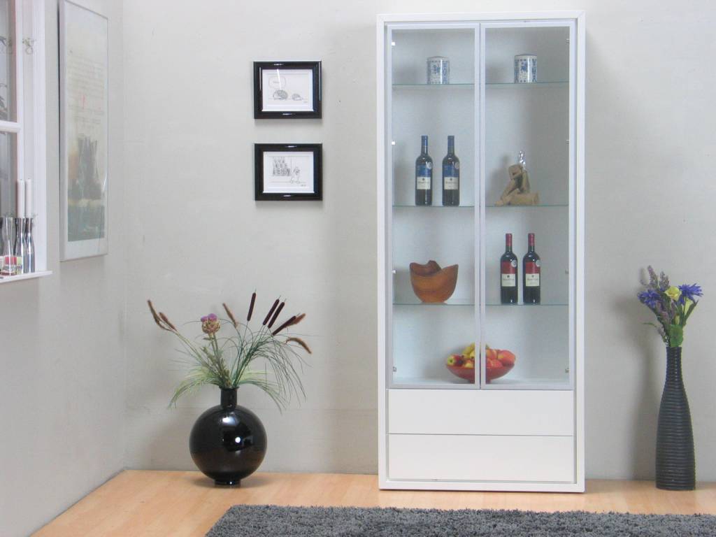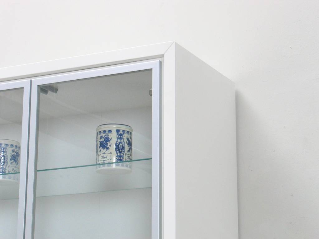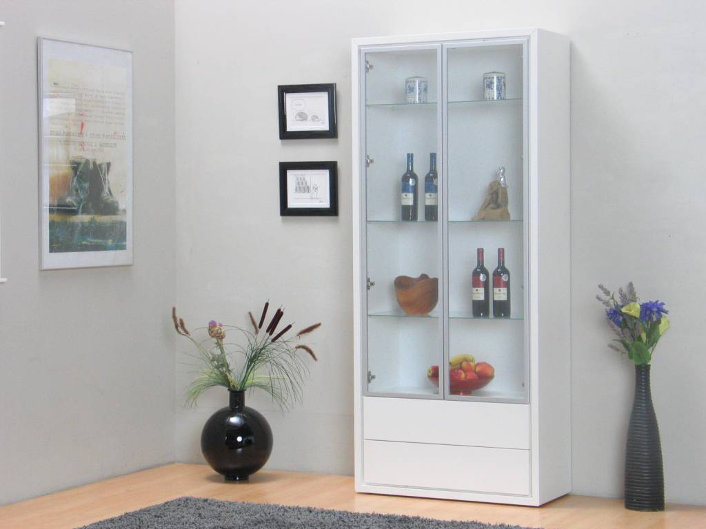 Strakke design vitrinekast Quadra. Een witte vitrinekast van 201cm hoog en 86 cm breed met metalen skin en push to open beslag, dus greeploos! Mooi design voor een nette prijs bij hioshop: uw meubelwebwinkel.