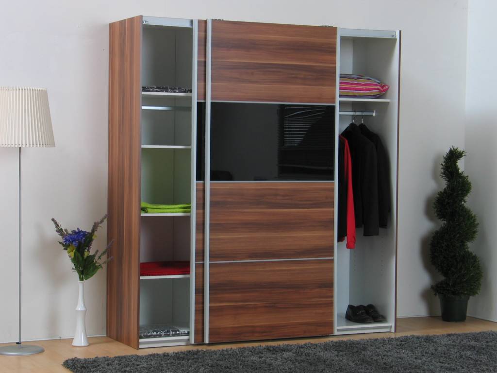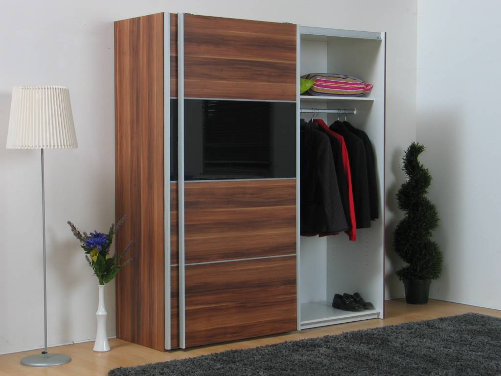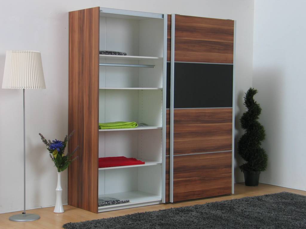 Ruime en stevige zweefdeurkast, uitgevoerd in walnootkleur met zwart! Haal dit prachtmeubel dus nu in huis: deze kast past op iedere slaapkamer! Inclusief gratis pakket met 3 legplanken zodat u de kast naar wens kunt indelen.
