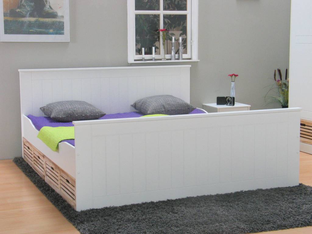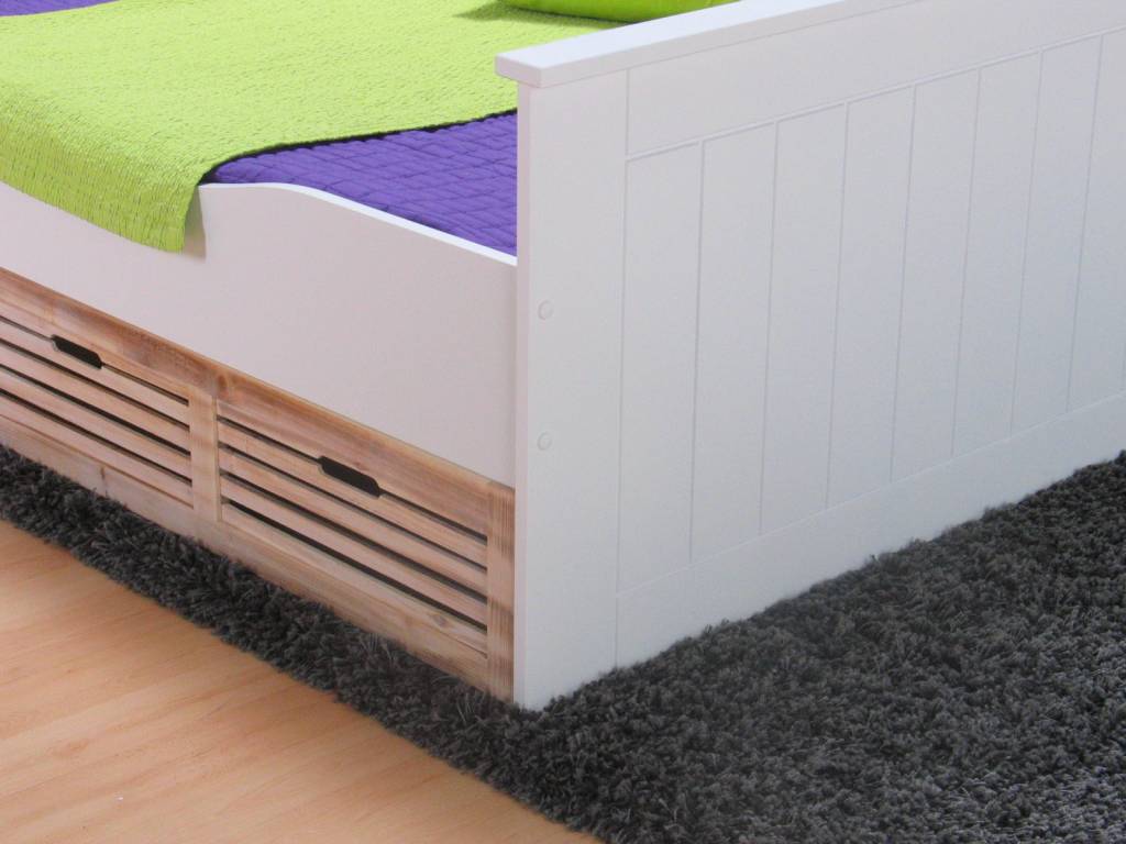 Bed met 4 brede schuiflades eronder; zowel aan de linker- als aan de rechterkant zijn 2 brede schuiflades eronder te schuiven.