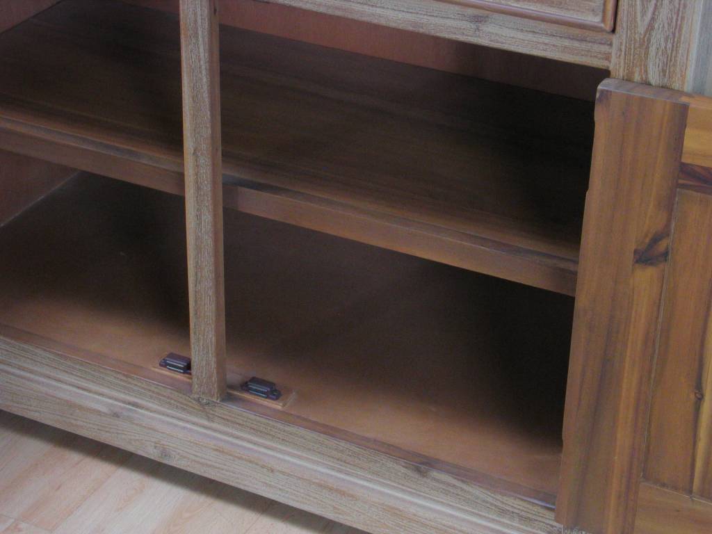 Bovenin 4 lades naast elkaar met daaronder 4 deurtjes naast elkaar. Achter iedere 2 deurtjes bevindt zich één open vak met een brede losse legplank.