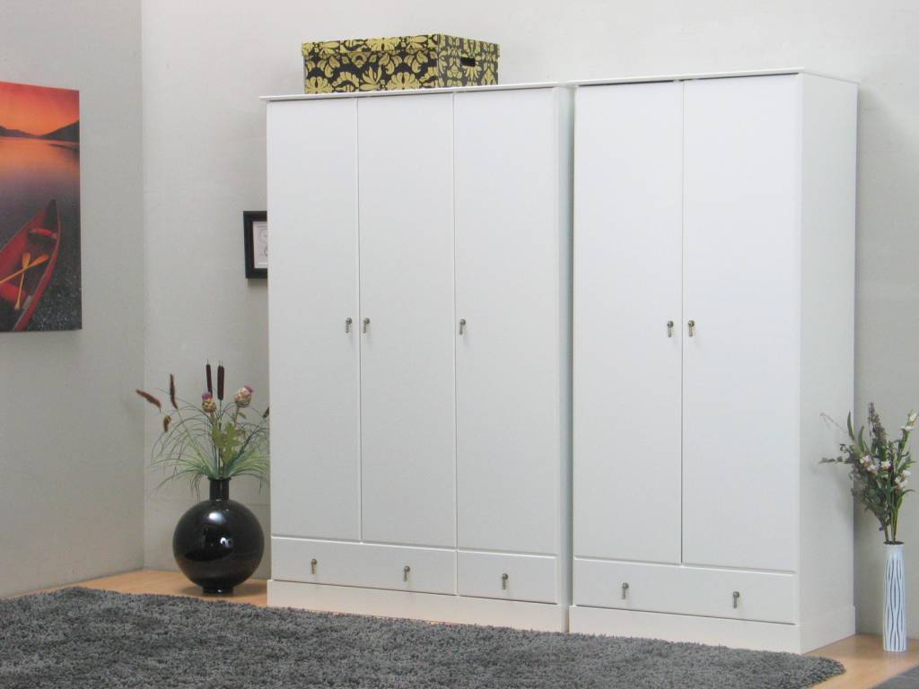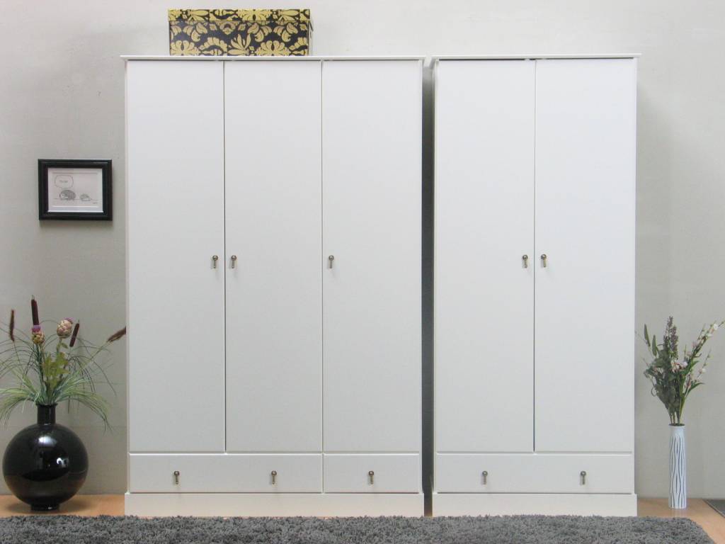 Vijfdeurs witte kledingkast Barlett. Dit is een set kledingkasten samengesteld uit de 2deurskast en de 3deurskast. Compleet wit MDF met veel hangruimte. Met 2 brede lades en een smalle lade biedt de kast als geheel veel opbergmogelijkheden!