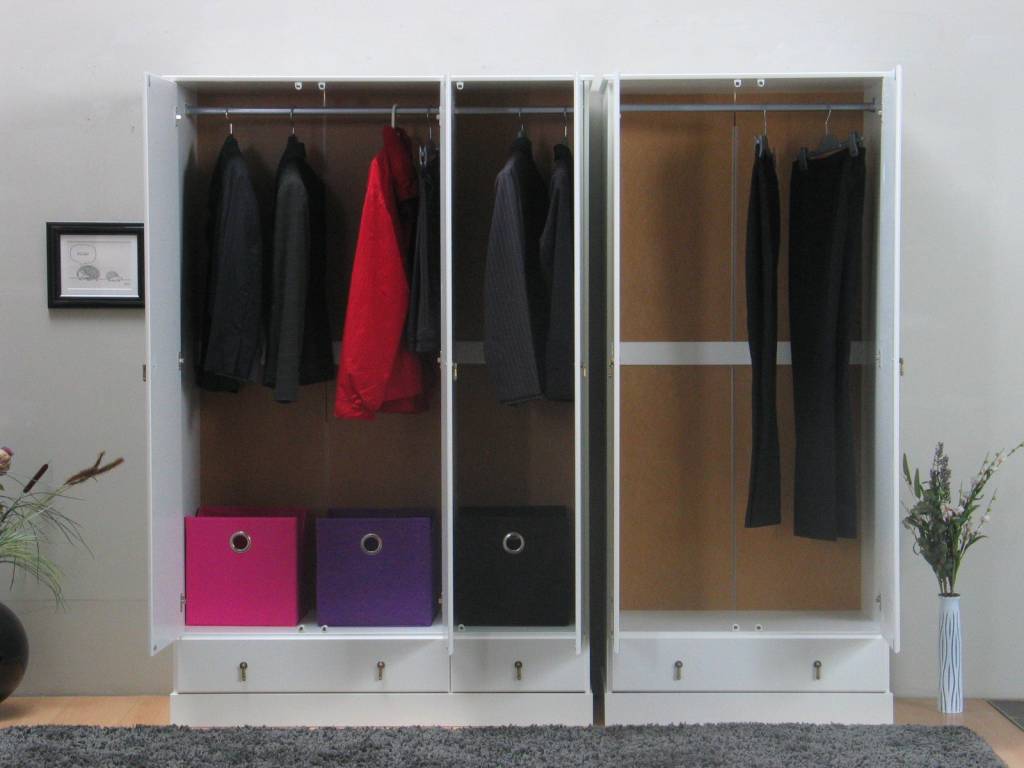 2 deuren met daarachter een brede kledingstang en een bodemplaat met daaronder een brede schuiflade.