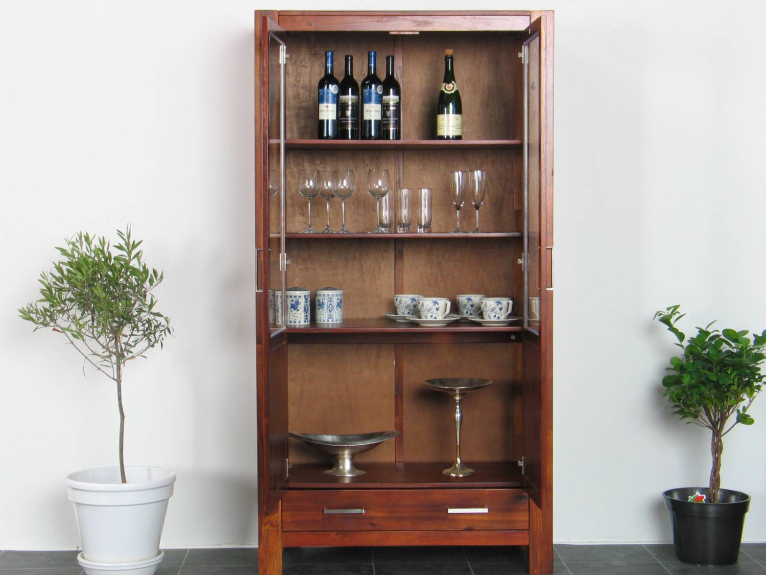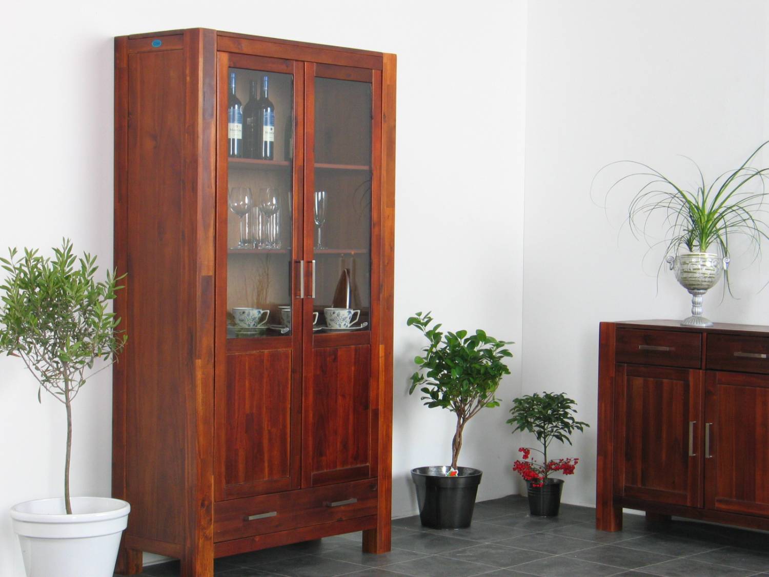 Een grote, stevige vitrinekast, gemaakt van acaciahout. Geef uw woonkamer een exotisch tintje! Te koop bij Hioshop voor een zeldzame actieprijs, zo lang de voorraad strekt!