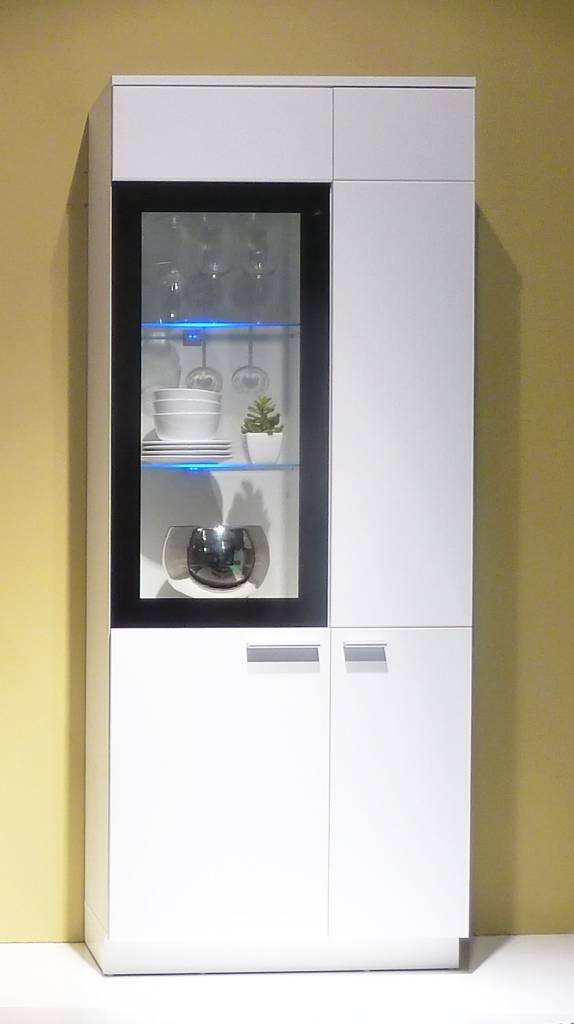 Mooi wit highboard Luna: een highboard of hoge kast met klasse. Fraai wit met een glazen venster van gehard glas en een zwarte omlijsting waarachter u een kostbaar bezit kunt tonen. Bijpassende LED verlichting is los bij te kopen in de shop!