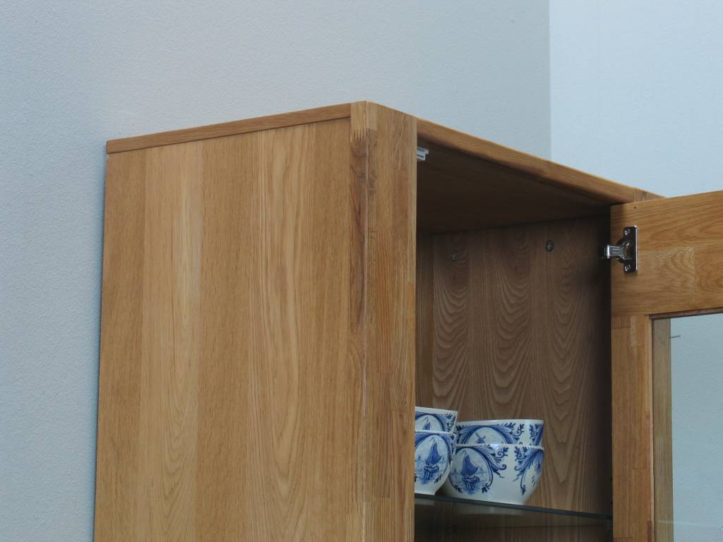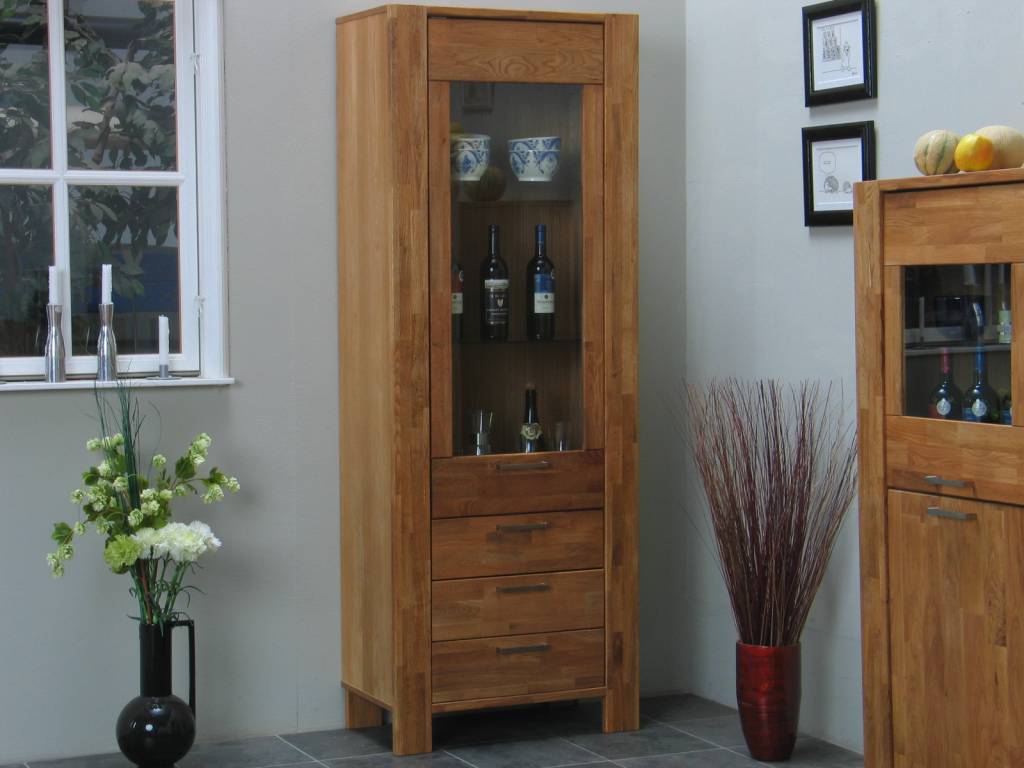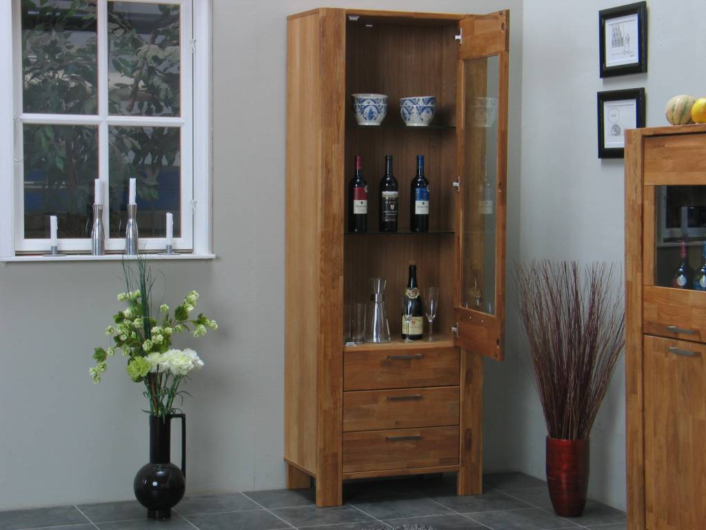 Vitrinekast in de serie Mark, met 4 lades en een deur met glas! Bovendien heeft het meubel 2 glazen opzetplanken achter de deur. Past goed bij de overige meubelen uit de serie Mark, zoals bijvoorbeeld de eettafel!
