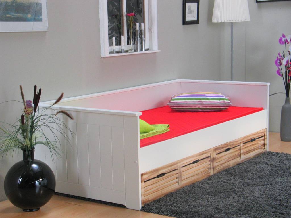Bed met een brede schuiflades eronder; welke dienst kan doen als logeerbed (uitschuifbed).