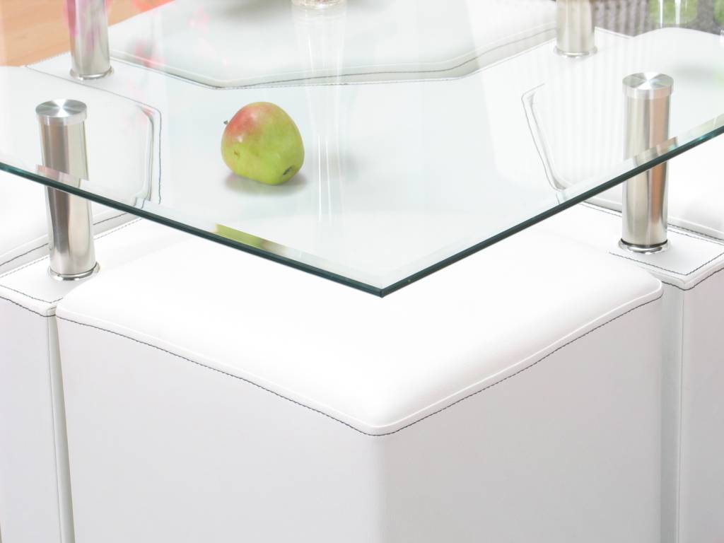 Vierkante witte salontafel Kim, speels design, inclusief 4 poefjes en een stevig facetgeslepen glazen tafelblad. Leuk voor in uw woonkamer of wachtruimte! Ook verkrijgbaar in zwart en bruin.