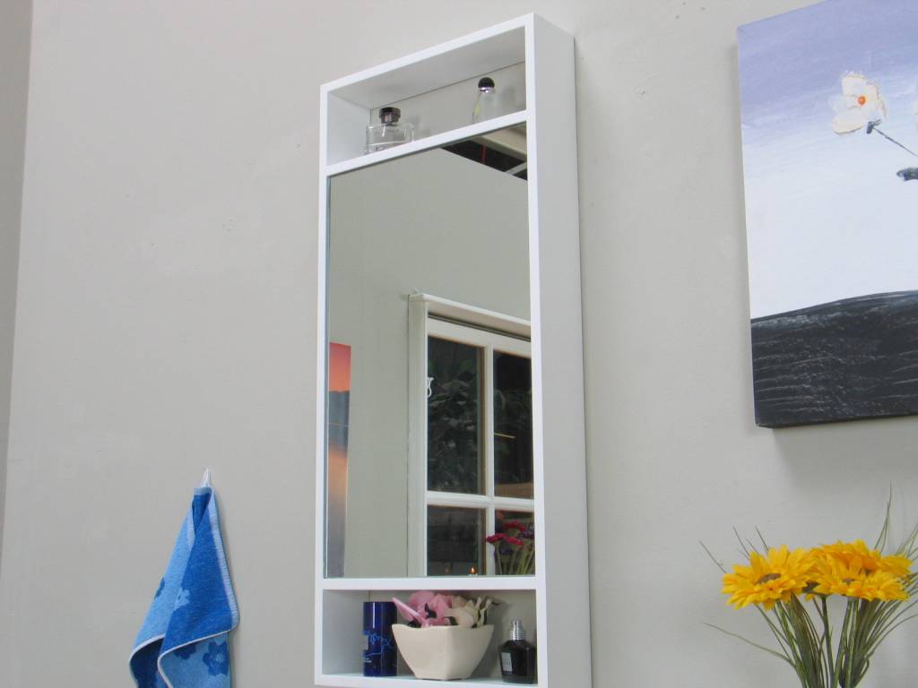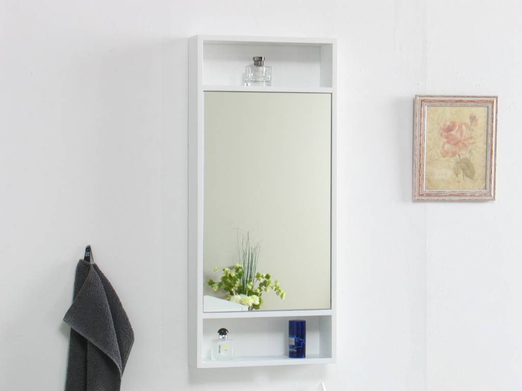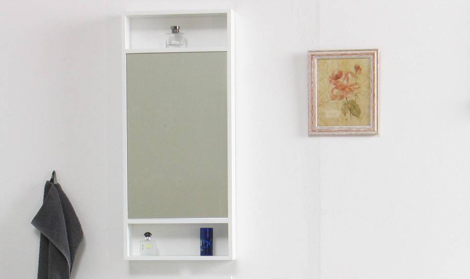 Spiegel Sire met witte opzetrand voor in uw badkamer. Onder de spiegel zit een open opbergvakje. De spiegel is compleet opgebouwd; uitpakken en ophangen dus! Bekijk ook de bijpassende witte kolomkast Sire.
