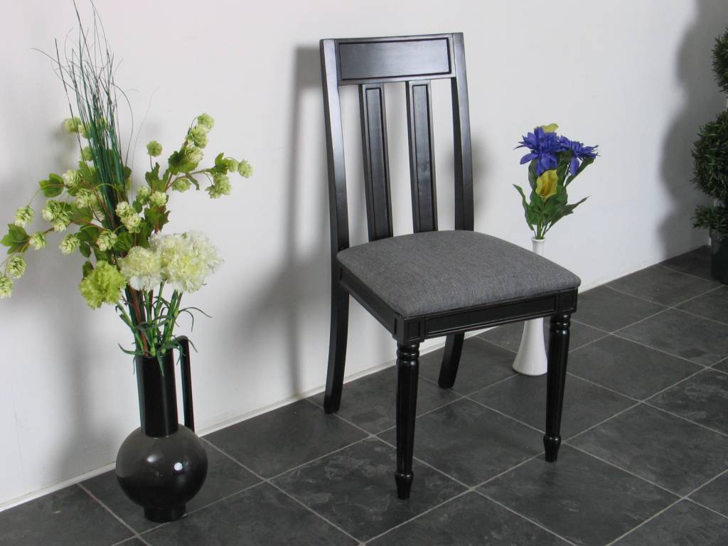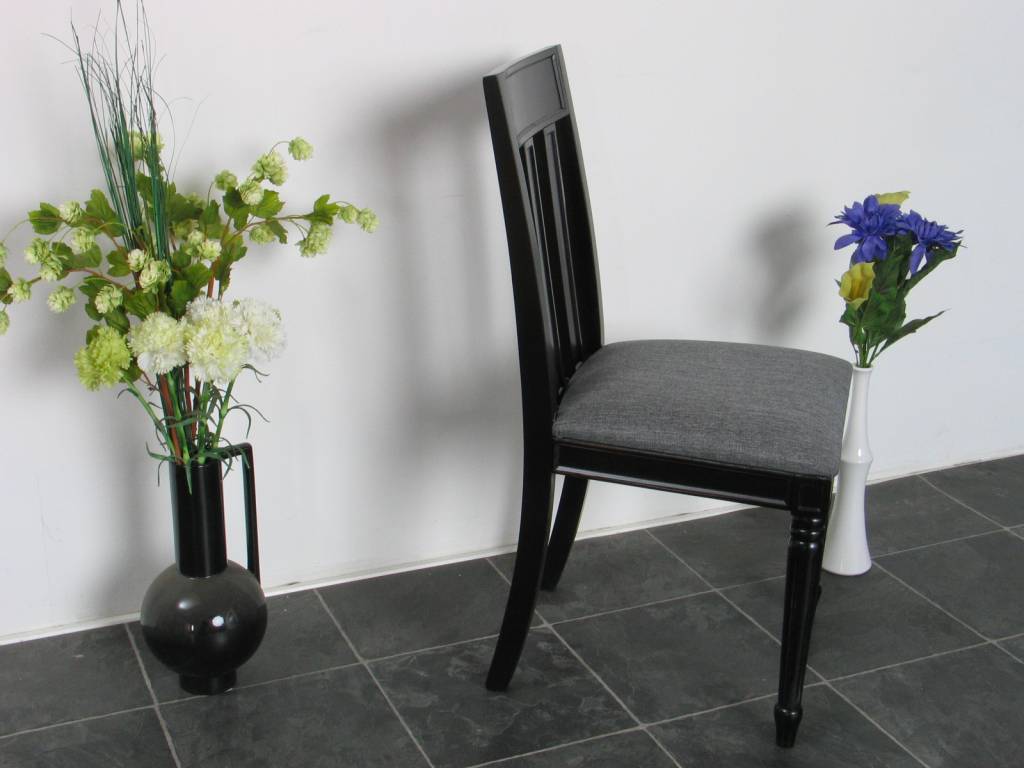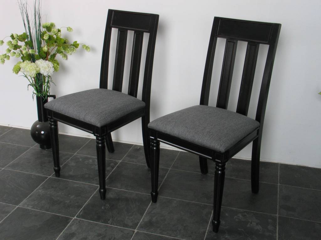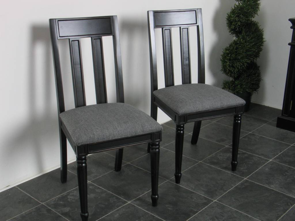 Stijlvolle stoelen uit onze serie Mozart! Gemaakt van massief gelakt hout en met grijze stoffen bekleding. Bovendien worden de stoelen opgebouwd geleverd! Uitpakken en neerzetten dus!